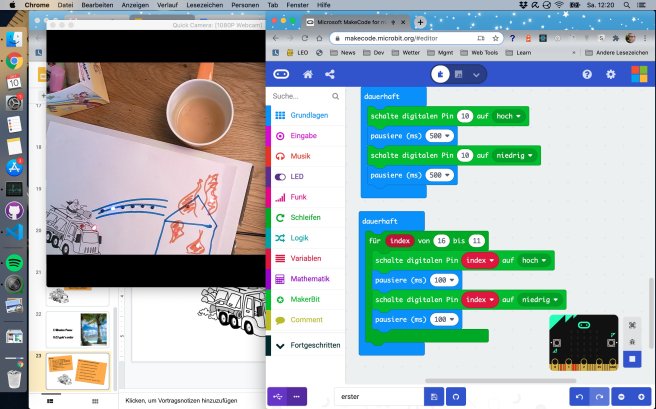 Micro:bits sind kleine Einplatinencomputer, die man mit grafischen Elementen im Webbrowser programmiert. Da wir den Kurs als Videokonferenz durchführen, bekommt jeder die Workshop Box „LED Spezialeffekte“ geliehen. Sie enthält alles, was wir benötigen: den Minicomputer, das MakerBit Board und kommt mit vielen Leuchtdioden (LED). Wir arbeiten gemeinsam in kleinen Gruppen, lernen mit den Bausteinen Schritt für Schritt Programme zu kreieren, und so die LEDs zu steuern.